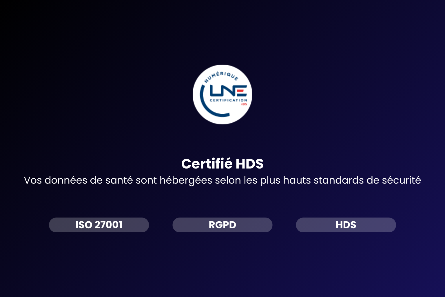 - Hébergement certifié HDS (Hébergeur de Données de Santé)